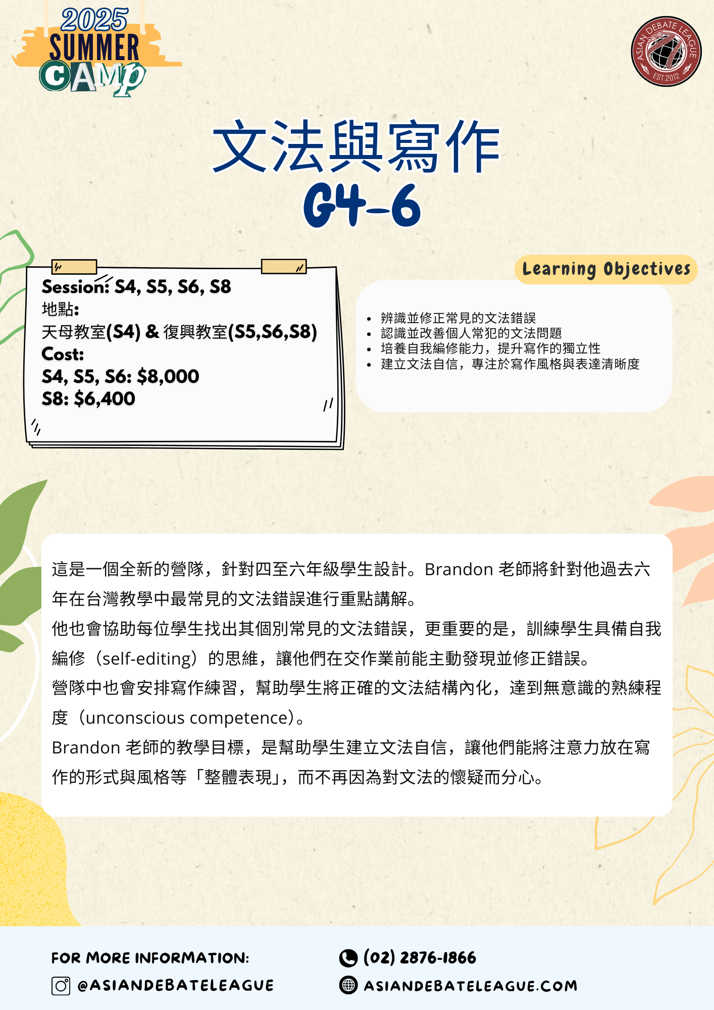 G4-6 Grammar & Writing 文法與寫作 2:00-4:00 PM $8,000