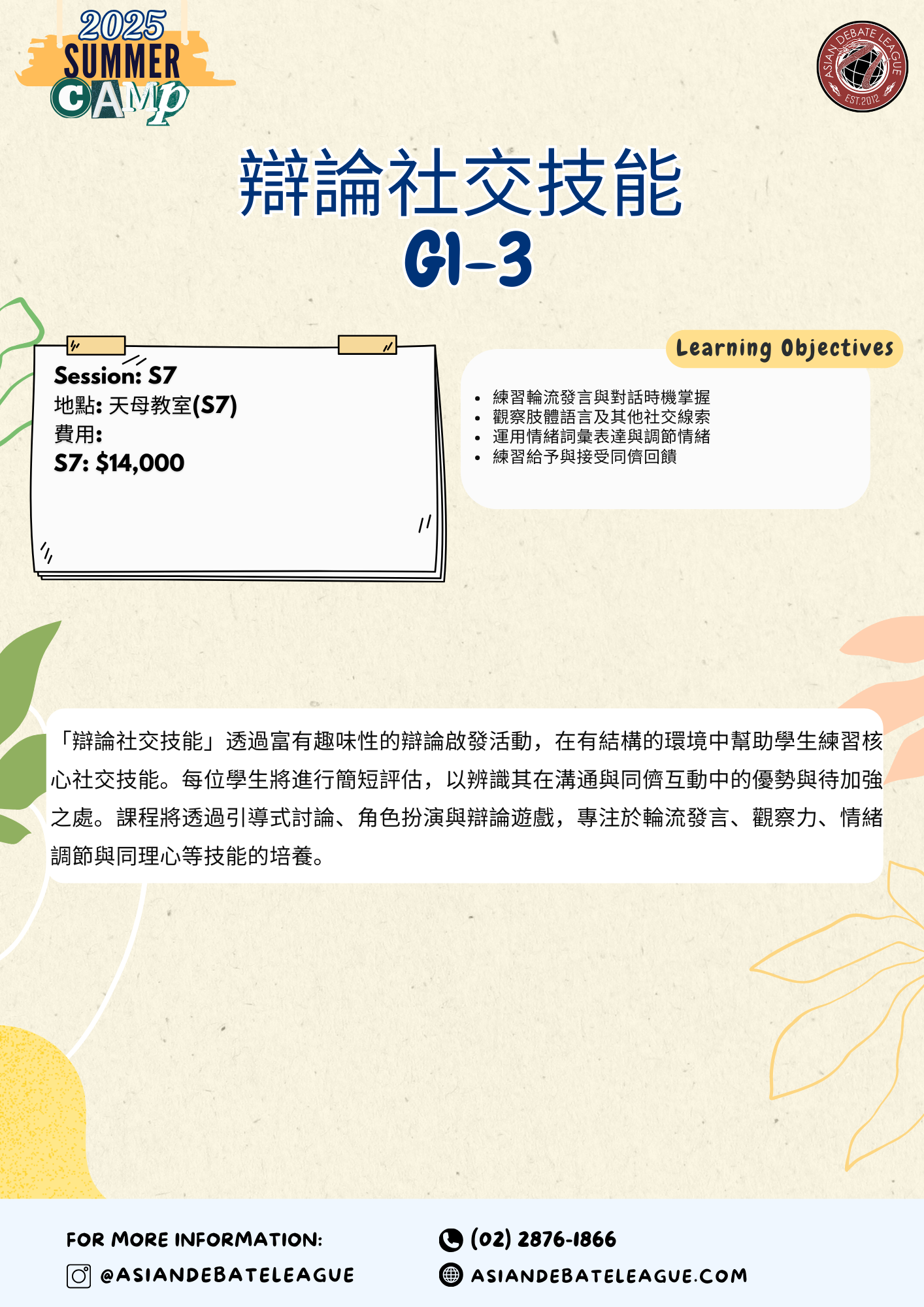 G1-3 Debate Social Skills 辯論社交技能 11:00-1:00 PM- $14,000